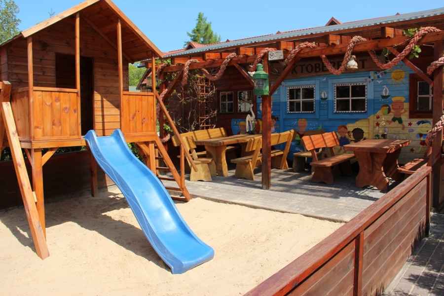 - na zewnętrz dodatkowo ogrodzony kolorowy PLACYK ZABAW dla dzieci,