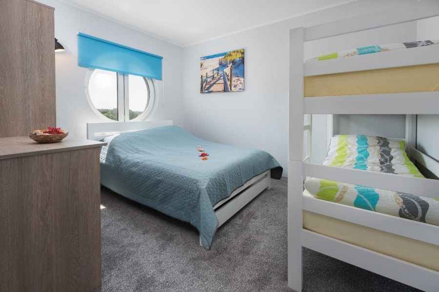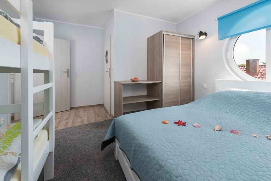 - sypialnia z okrągłym oknem, z małżeńskim łożem oraz z łóżkiem piętrowym,