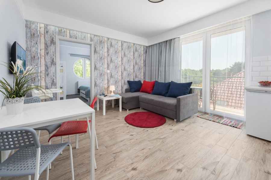 - pokój dzienny z rozkładaną rogówką, z TV LCD, z aneksem kuchennym (lodówka z zamrażalnikiem, 2 palnikowa kuchenka elektryczna, zlew kuchenny, czajnik elektryczny, komplet naczyń i sztućców) wraz z wyjściem na duży balkon (na balkonie 2 krzesełka i stolik kawowy),