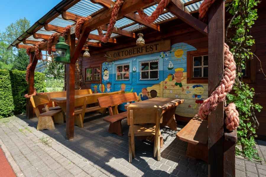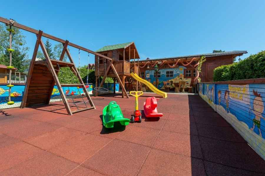 - na wyposażeniu obiektu znajdują się: łóżeczka turystyczne z dodatkowymi materacykami, krzesełka do karmienia, wanienki, nocniki, nakładki na toaletę, stołeczki do mycia rączek, naczynia i sztućce plastikowe.