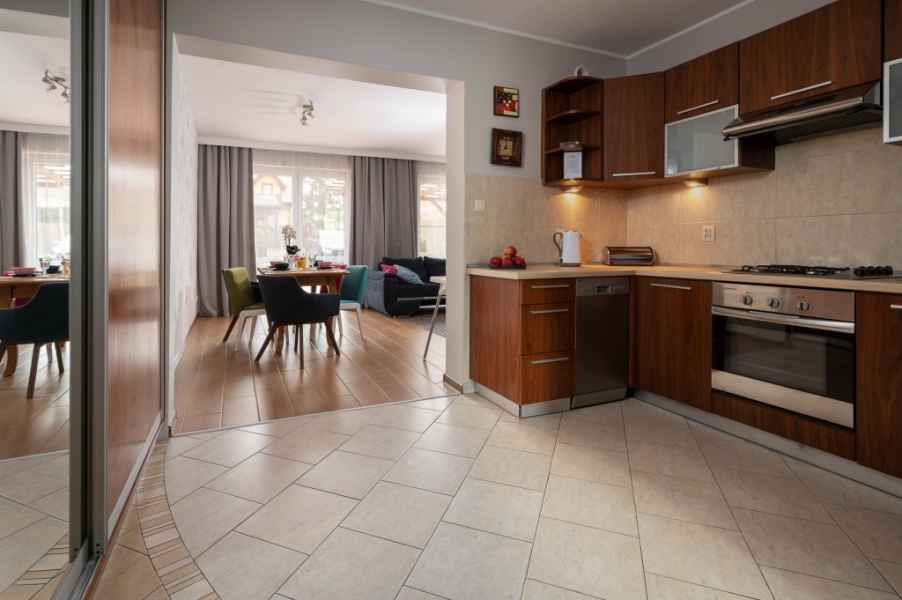 - w pełni wyposażona kuchnia (kuchenka gazowa z piekarnikiem, duża lodówka z zamrażalnikiem, zmywarka, mikrofalówka itp.),