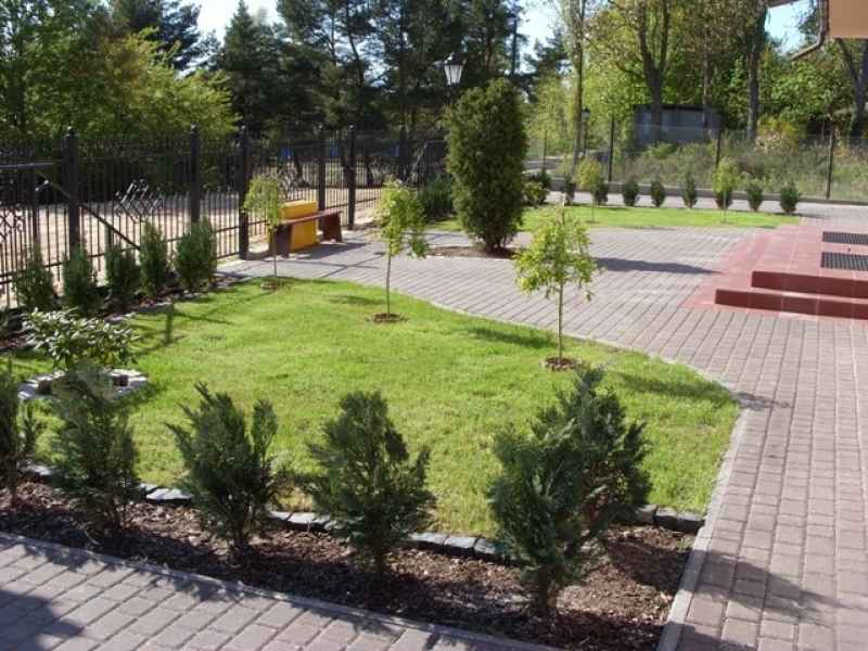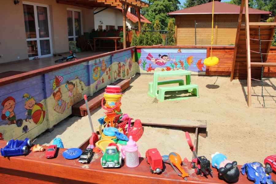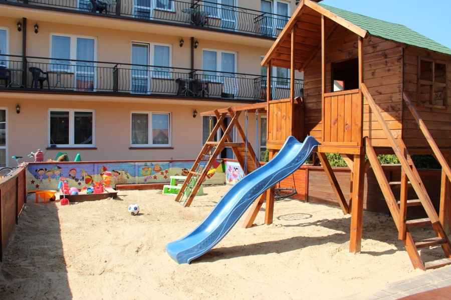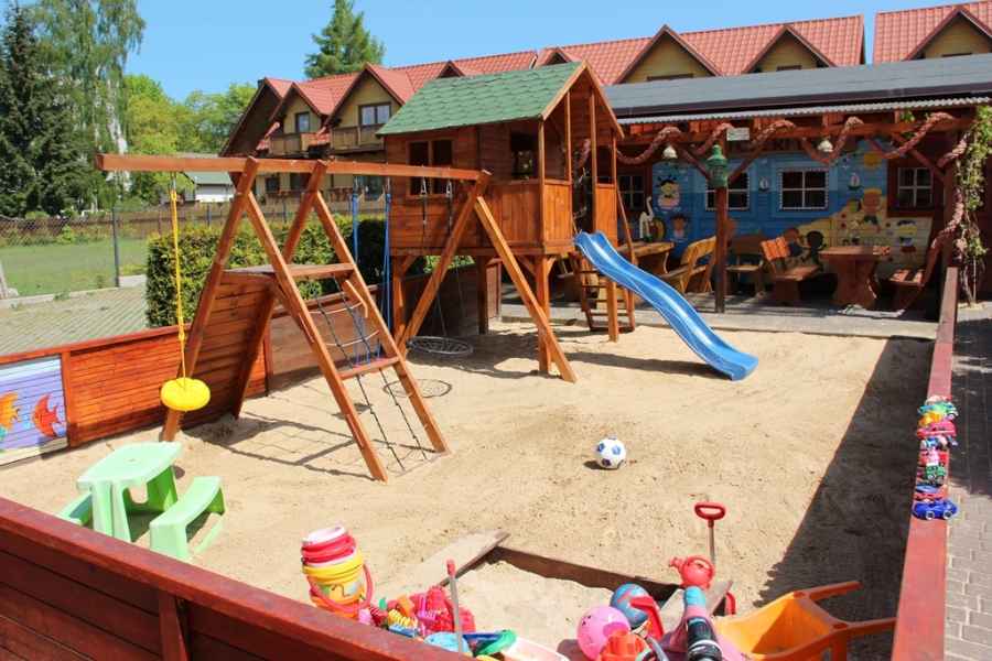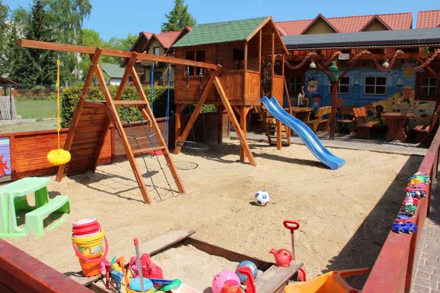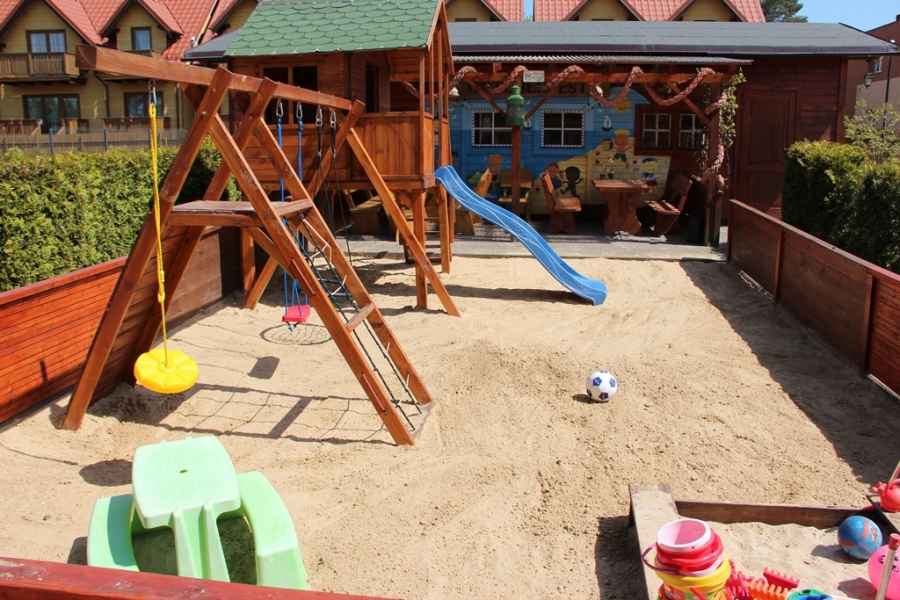 - na zewnętrz dodatkowo ogrodzony kolorowy PLACYK ZABAW dla dzieci,